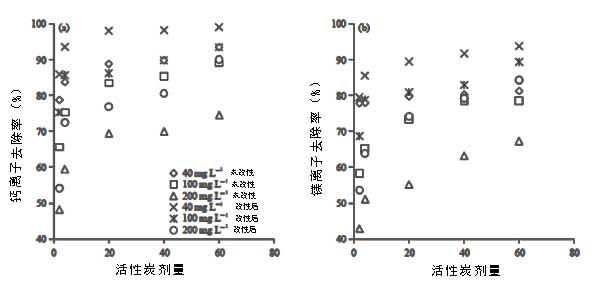 對于吸附實驗,僅研究用3.0wt%KMnO 4熱解和改性的活性炭,能對于水處理足夠穩定并且以較小的熱解溫度生產。因此,選擇該樣品用于線束移除實驗。值得注意的是,熱解的未改性活性炭在水硬度溶液中相當不溶。這表明熱解的未改性活性炭的表面是非常疏水的。在活性炭對Ca 2+和Mg 2+離子的吸附效率中可以看出,Ca2+的吸附效率和Mg 2+離子增加了與具有相同硬度濃度的溶液增加吸附劑用量,并用硬度濃度的增加而降低對于相同的吸附劑劑量(圖2)。然而,吸附容量隨著初始硬度濃度的增加而增加。此外,可以看出Ca 2+和Mg 2+離子對用3.0 wt%KMnO 4改性的活性炭吸附效率與在相同劑量和硬度濃度下熱解的未改活性炭觀察到的值相比,改性的活性炭更高。此外,對于相同的劑量和硬度濃度,Ca 2+離子(圖2a)與Mg 2+離子(圖2b)相比顯示出更高的吸附效率,這表明活性炭對Ca 2+離子的選擇性更高。