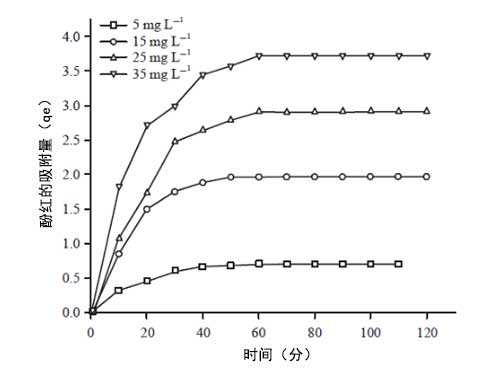 影響酚紅初始濃度的影響:q e(每克吸附劑吸附的酚紅量)(mg g-1)與接觸時間(min)的關系,使用不同的初始濃度(5-35mg)在給定的吸附劑量(5g L-1)和pH(2.0)下,L-1的酚紅顯示在圖3中。由于吸附-解吸平衡,每個圖表顯示吸附隨接觸時間的初始增加,然后在特征接觸時間達到飽和,表明在研究活性炭上酚紅的單層覆蓋。吸附的染料量和達到吸附平衡所需的時間隨著底物(染料)初始濃度的增加而增加。很明顯,因為在較高的染料初始濃度下,活性炭表面上相互作用的吸附分子的數量變得更高。
