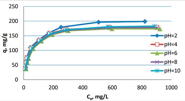 3.還發現了pH對活性炭的吸附效率的不顯著影響。觀察到與接近中性的溶液相比,酸性和堿性溶液的吸附更好。大量吸附是從pH=2的溶液中獲得的,但與pH=6的溶液的吸附相比,所獲得的吸附容量僅高9%。