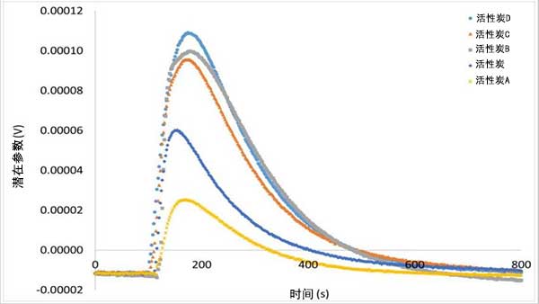 存在兩個參數(shù)之間的比例,因?yàn)榇嬖诳捎糜诜肿舆M(jìn)入的更大空間,這在吸附物和多孔結(jié)構(gòu)之間產(chǎn)生更大的相互作用。具有更高比表面積和更大相互作用的活性炭是炭D,由于吸附物和碳質(zhì)結(jié)構(gòu)之間的親和力,由于選擇性除去含氧基團(tuán)而產(chǎn)生更高的表面積并產(chǎn)生更高的浸入焓值。活性炭A具有最低的表面積值和較低的焓相互作用,因?yàn)楸砻嫜趸鶊F(tuán)降低了活性炭的可用空間以進(jìn)入己烷,并且由于其極性特征而產(chǎn)生與分子的較少相互作用。
