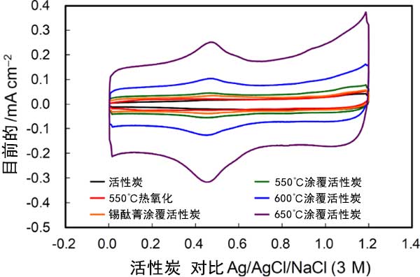 在沒有釩離子的酸性電解質中獲得的循環伏安圖顯示在圖3中。伏安圖中的電流由三個組分組成,即活性炭-電解質界面處的電化學雙層充電電流,以及由于表面官能團的氧化還原反應和活性炭表面氧化引起的法拉第電流。電化學雙層充電產生恒定電流和矩形CV形狀。電流取決于基面和邊緣平面的曝光程度,在0.5V附近的寬氧化還原峰和0.8V以上的氧化電流分別歸因于醌/氫醌樣表面官能團的氧化還原反應和活性炭表面氧化。這些電流在熱氧化后增加,并且在錫酞菁涂覆活性炭的熱氧化期間隨著溫度的升高而增加。電化學雙層電流的增加歸因于邊緣平面的暴露,這與拉曼光譜一致。對于錫酞菁涂覆活性炭觀察到的活性炭表面氧化電流意味著高表面粗糙度的發展。