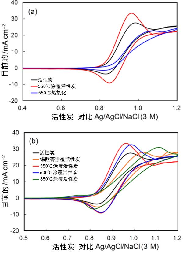 通過在700℃的氬氣中的單步熱處理中通過升華,沉積和錫酞菁的熱解形成的活性炭表面上的含錫碳質薄膜的熱氧化,實現了同時的活性炭的納米級表面蝕刻和二氧化錫的負載。這種活性炭對氧化還原液流電池的正極和負極反應起到增強效果,全電池測試顯示充電和放電過程的過電位顯著降低,以及穩定的循環性能。提出了一種基于活性炭表面納米級處理的簡便有效的技術,以顯著提高氧化還原液流電池性能。