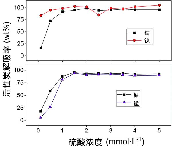 在使用活性炭成功吸附鈷之后,研究了用硫酸汽提以回收金屬離子并允許重復使用吸附劑。我們分別測試了三種回收參數,實驗發現低濃度的硫酸就足以去除大部分活性炭吸附的鈷(II),鎳(II)和錳(II)。由于僅有少量鎳(II)被吸附到活性炭上,因此解吸溶液中的鎳(II)濃度也很小。其結果是,對于鎳(II),元素分析的微小差異導致解吸百分比的相對大的差異,這可以在圖4中看出。