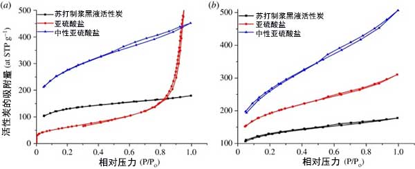 圖1顯示了活性炭在-196℃的氮氣吸附等溫線和孔徑分布及其紋理特征。從看到的圖1中,活性炭的吸附等溫線在很大程度上受到制漿工藝的類型的影響。但是使用蘇打制漿黑液作為前體從活性炭獲得的等溫線遵循I型吸附等溫線。活性炭的氮吸收在非常低的相對壓力下略微增加,隨后在平臺形式中略微吸附增加,相對壓力增加至1,表明存在微孔性。但是,來自亞硫酸鹽的中性亞硫酸鹽制漿的活性炭的等溫線提供了I型和II型的吸附等溫線,這反映在碳結構中存在一些中孔。