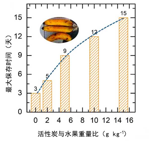 為了研究活性炭用量的影響,改變了活性炭和水果的質量比。圖4顯示了活性炭與水果的保存時間與質量比的范圍為。活性炭的量會影響保質期,并且可以看到非線性相關性(見圖4中的虛線)。沒有活性炭達到存在,水果儲存時間僅為3天。根據添加的活性炭的質量,保質期可以從2天延長至12天。通過添加15克吸附劑用于1千克水果,可以實現延長高達5倍的保質期。較高質量的活性炭提供較長的保存時間,這可能是由乙烯吸附的活性位點含量較高引起的。結果表明,氧化鈷浸漬的活性炭有望用于延長水果的保質期。