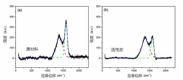 圖1:拉曼光譜分析:(a)原材料(b)活性炭。