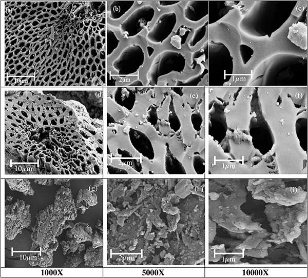 FESEM:三種活性炭在不同放大倍數(shù)下的顯微圖像顯示在圖3中。空果束活性炭樣品產(chǎn)生的蜂窩狀圖案孔隙網(wǎng)絡(luò)與優(yōu)化的碳納米管相似。油棕纖維活性炭上的孔也類似于空果束活性炭的蜂窩圖案。然而,與油棕纖維炭和棕櫚仁殼炭相比,空果束炭中的孔網(wǎng)絡(luò)更加突出和發(fā)展。棕櫚仁殼活性炭樣品顯示出很少的隧道孔,并含有阻塞毛孔的可見微塊。發(fā)達(dá)的多孔網(wǎng)絡(luò)表明可以沉積吸附物或離子的高表面積。