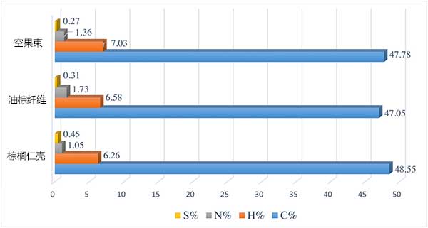 CHNS分析:在碳化和活化之前分析預(yù)處理活性炭的元素組成。圖4顯示了預(yù)處理樣品的定量元素分析的圖示。碳是所有樣品中最突出的元素,棕櫚仁殼,空果束和油棕纖維分別為48.55%,47.78%和47.05%。空果束含有7.03%的氫和1.36%的氮。油棕纖維含有6.58%的氫,1.73%的氮,而棕櫚仁殼含有6.26%的氫和1.05%的氮。對(duì)于所有活性炭樣品,硫含量不太重要,因?yàn)樗鼈兒康陀?%。