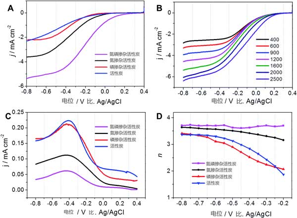 活性炭樣品通過兩步法制備,包括原位氧化聚合和高溫熱解。這里,苯胺和植酸分別用作氮源和磷源。為了研究氮磷碳比對活性炭的氧化還原電催化活性的影響,在中性介質中進行循環伏安圖。旋轉圓盤電極伏安圖在氧飽和的50mM磷酸鹽緩沖溶液中進行,結果顯示在圖2A中。在摻雜碳改性后,活性炭基催化劑的起始電位顯示出從0V到+0.22V的大的正向偏移,氧化還原電流密度也大大增加。此外,由共摻雜碳改性的活性炭電催化活性優于由單摻雜碳改性的活性炭電催化活性。在進行旋轉環盤電極測量以研究不同催化劑的過氧化氫的產生(圖2C)。正如預期的那樣,氮磷摻雜活性炭顯示出比其他催化劑更低的過氧化氫產生。可以看出,氮磷摻雜活性炭在氧化還原起始電位和高電流電流方面對氧化還原具有優異的電催化活性,突出了N,P共摻雜和中孔結構對氧化還原的重要性。