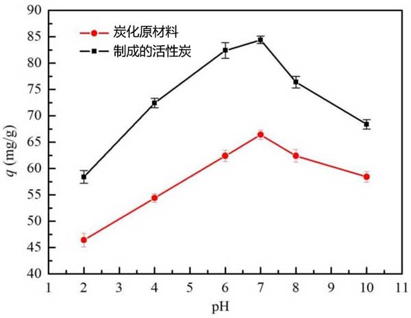 pH值的影響:吸附研究中最重要的因素之一是培養基pH的影響。根據吸附劑的用途,不同的物質表現出不同的pH范圍。pH值對活性炭平衡吸附柴油的影響如圖3所示。當吸附劑的pH值從2增加到10時,吸附劑用量,吸附劑溫度和接觸時間分別為0.2g,30℃和240秒。在酸性條件下,發現吸附容量隨pH增加而增加。當pH為7時,吸附容量達到最大值。當pH值繼續升高并且溶液系統變為堿性時,吸附容量下降。這些結果表明,堿性和酸性環境不適合生物炭的吸附過程,活性炭吸附柴油的最佳pH值為7。這種變化可通過溶液中質子數量的變化來解釋。和油乳液的穩定性。強烈的酸性導致油脂聚結,隨后增加油滴的大小。由于初始pH>7,由于酸性物質的存在,柴油的溶解度增加,這使得柴油難以吸附在活性炭上。隨著初始pH的增加,過量的羥基離子和柴油競爭溶液中的活性吸附位點。
