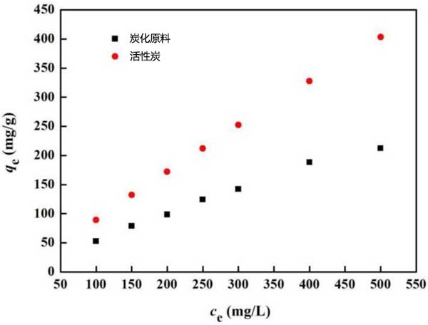 吸附等溫線:吸附等溫線對于描述溶質如何與吸附劑相互作用非常重要,并且對于優化吸附劑的使用至關重要。Langmuir等溫線假定單層吸附在含有均勻策略和吸附的有限數量的吸附位點的表面上,而在表面平面內沒有吸附物的遷移。圖4顯示了柴油在所制備活性炭上的平衡吸附等溫線。從圖中可以看出,與炭化原料相比,活性炭的吸附等溫線更接近直線。隨著柴油溶液濃度的增加,活性炭對柴油溶液的吸附能力不斷增加。當柴油濃度為500 mg/L時,活性炭達到最大吸附量。然而,當柴油溶液濃度達到400 mg/L時,炭化原料的吸附容量增加緩慢。可能是柴油顆粒覆蓋了材料的表面,導致吸附速率降低。從圖4中可以清楚地看出,活性炭的吸附能力明顯強于炭化原料。