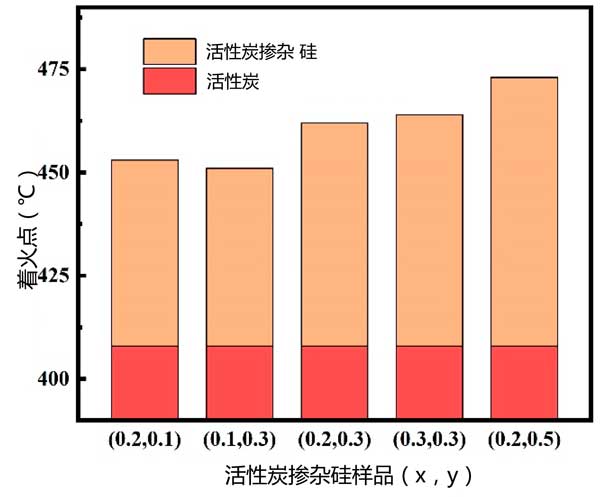 燃點:在不同條件下獲得的原料和復合材料的著火點如圖3所示。觀察到硅摻雜到活性炭中會使點火溫度升高至少40℃。這種制備活性炭載硅復合吸收材料的方法有益于改善阻燃性。