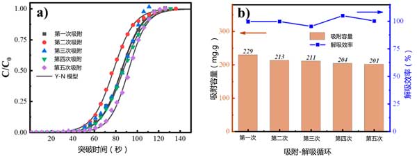 圖5:(a)循環實驗期間的突破曲線。(b)吸附容量和解吸效率。