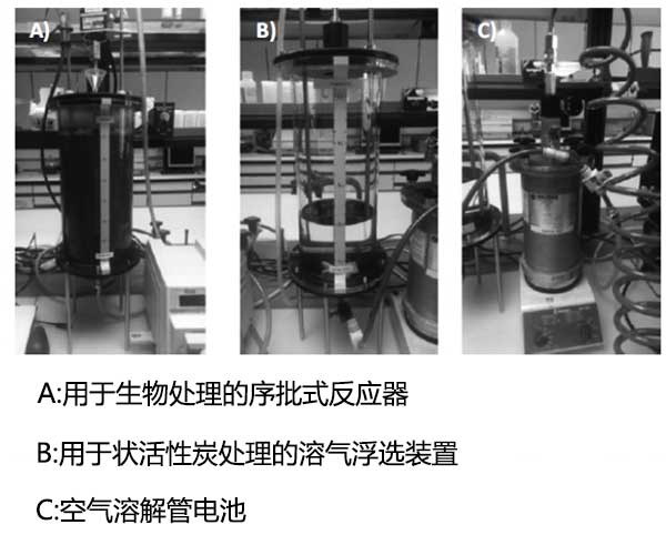 污水處理廠的活性污泥用于承載微生物,收集活性污泥并對其主要參數進行表征銨,硝酸鹽,亞硝酸鹽,磷酸鹽,化學需氧量,生物需氧量,總懸浮固體和pH每周一次,并儲存在4°C直至使用。將5L活性污泥泵入生物處理的序批式反應器,混合并充氣2小時,然后使污泥靜置30分鐘。將1.7L上清液轉移至活性炭處理的溶氣浮選裝置單元,其中加入粉末狀活性炭并混合(30分鐘)。下一步包括加入凝結劑聚氯化鋁,12分鐘后加入絮凝劑。最后,將飽和水注入活性炭處理的溶氣浮選裝置裝置,開始分離步驟(12分鐘)。整個過程持續了大約四個小時。