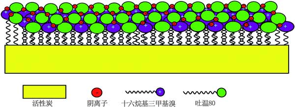 用表面活性劑改性的活性炭在電吸附過程中具有潛在的應用,其中表面電荷和潤濕性起重要作用。用離子表面活性劑功能化的活性炭電極最近在電容去離子技術(shù),特別是反向電容去離子系統(tǒng)中引起了相當大的關(guān)注。圖3表明在用吐溫80和HDTMA的二元混合物改性的活性炭上吸附陰離子。吐溫80的存在表明HDTMA的吸附密度增強,完美填充(高穩(wěn)定性),這在電吸附過程中都是值得的。實際上,HDTMA的增強的吸附密度誘導了陰離子污染物的高吸附能力。此外,改進的填料賦予表面活性劑在表面上的穩(wěn)定性。這些特殊效果是混合表面活性劑體系應用的最終目標之一,為了提高活性炭的表面活性,對于單一表面活性劑體系來說,這是不可能發(fā)生的。