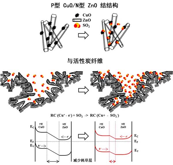 在圖3中,CuO顆粒隨機分散在ZnO花表面上。當CuO顆粒與ZnO花結合時,在p型CuO顆粒和n型ZnO花之間的界面處形成p/n結。在這種機制下,電子從n型ZnO轉移到p型CuO,并且空穴通過p型CuO到達n型ZnO,直到在系統中建立均勻的費米能級,從而導致能帶在耗盡層彎曲。然而,當CuO-ZnO組合結構暴露于SO 2時,電子通過Cu +之間的氣敏反應釋放和SO帶負電的2 -離子。還原的SO 2分子與CuO中的孔結合,從而減少了耗盡層和電阻。這種現象可通過降低電阻來實現良好的SO 2檢測。因此,p型CuO和n型ZnO的傳感響應的貢獻代表了傳感器的主要特性,而活性炭纖維的比表面積在SO 2傳感特性中起著重要的作用。
