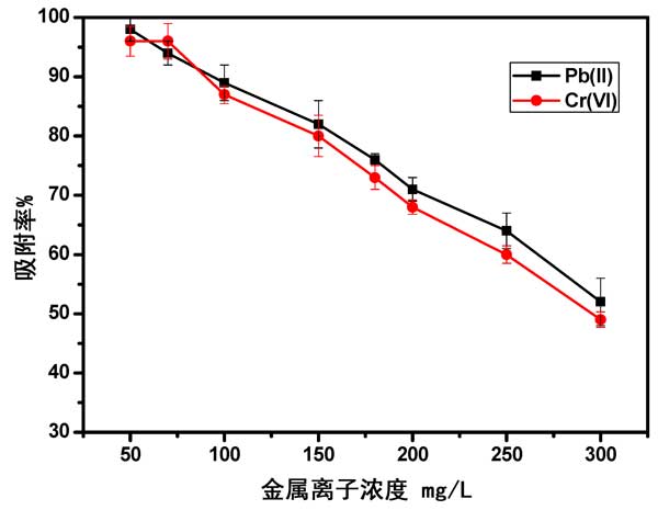 金屬離子濃度的影響:使用0.80 g和1.00 g的活性炭在50至300 mg/L的各種濃度的Pb(II)和Cr(VI)濃度下進行Pb(II)和Cr(VI)離子的吸附。圖3中的結(jié)果表明,Pb(II)和Cr(VI)離子的最大吸附量分別為50和70 mg/L。這可以歸因于以下事實:隨著濃度的增加,活性部位被覆蓋并飽和。