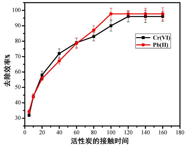 接觸時間的影響:使用較早獲得的合適活性炭劑量為0.80和1.0 g/100 mL,研究了接觸時間對Pb(II)和Cr(VI)離子在活性炭上吸附的影響。實驗是在25°C的合適金屬離子濃度值下進行的。Pb(II)和Cr(VI)離子分別為50.0和70.0 mg/L。如圖4所示,所研究的金屬在100和120分鐘后的最大去除效率達(dá)到98%和96%。而且,接觸時間的進一步增加對兩種金屬離子的去除沒有顯著影響。