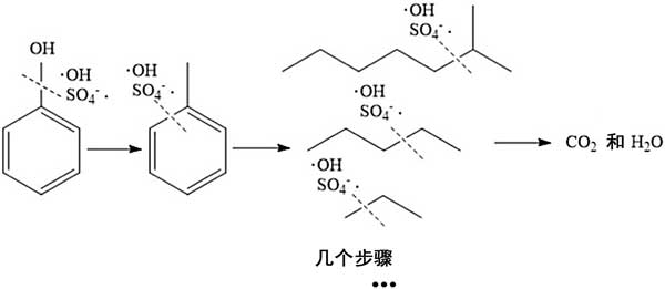 圖4顯示了苯酚的降解過程。首先破壞連接苯酚中羥基的化學鍵,然后打開苯環(huán)以形成通過單鍵連接的單鏈。隨著反應的進行,單鏈之間的化學鍵被破壞,并形成具有較少碳原子數(shù)的單鏈。將鏈重組為新的長鏈的過程是由于氧化劑劑量不足。然而,隨著反應的進行,諸如這些短鏈和新形成的長鏈的中間體被進一步降解。在此過程中,一些單鏈會隨著反應時間的增加而重組形成一條更長的新單鏈。隨著這一過程的繼續(xù),長單鏈逐漸分解成短鏈,然后苯酚礦化成二氧化碳和水。