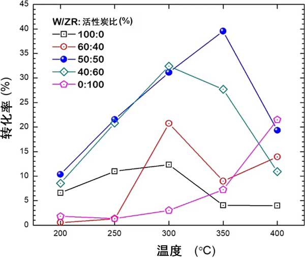 在第一部分中,我們比較了活性炭和氧化鋯單載體系統(tǒng)之間的性能;钚蕴繂屋d體顯示出高的重量比表面積,但仍低于合成為催化劑的活性炭。此外,其酸度高于氧化鋯的酸度,這被認為有利于酸催化的反應的活性。在圖1中,單載體催化劑的比較表明,在450-C的溫度下,W/ZR的轉(zhuǎn)化率高于W / 活性炭,而W / 活性炭在450°C時的轉(zhuǎn)化率比W/ZR高。W/ZR:活性炭的60:40和40:60在300°C時表現(xiàn)出最大的轉(zhuǎn)化率,分別約為21%和33%。我們發(fā)現(xiàn),最高的轉(zhuǎn)化率是由350:50的50:50 W/ZR:活性炭催化劑產(chǎn)生的。