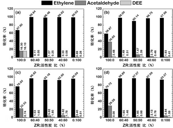 因此,提到在包含高達50wt%的活性炭的雙載體體系中發(fā)現(xiàn)的乙烯回收率的提高是由于來自活性炭的碳原子對催化劑的電子作用。另外,由于通過焦化的失活,大量的活性炭將導致乙烯回收率的降低,這是在高溫下與含碳反應物的反應中發(fā)現(xiàn)的常見的失活方案。這種失活導致活性位點的阻塞,降低了活性位點的數(shù)量,導致催化劑的總轉(zhuǎn)化率降低。