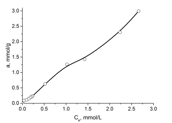 鍶離子的吸附平衡常數得出吸附平衡常數等于2,并且ΔG0值分別為0.5 kJ / mol。根據以前的數據,活性炭吸附劑-H2O的水界面ΔG0等于2.3 kJ / mol。具有比溶劑(水)低的標準摩爾吸附微分自由能(ΔG0)的吸附劑無法將其從吸附劑表面(從其孔隙)中置換出來,但是鍶離子在相對較高的平衡濃度下被吸附,其值這些離子的吸附量相當大(圖1)。這種現象可以通過以下事實來解釋:在低平衡濃度下,鍶離子與活性炭的多孔結構中的水分子相互作用,從而形成Sr(OH)+離子。活性炭微孔結構中Sr(OH)+的形成和擴散過程已有實驗。在相對較高的平衡濃度下,水分子不會因與羧基(-COOH)以及與磷酸鹽和多磷酸鹽基團(P = O,COP)相互作用而與活性炭結合的鍶離子置換。