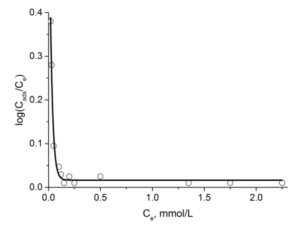 圖1顯示了活性炭上鍶離子從水溶液中的吸附等溫線。如圖1所示,即使在較高的平衡濃度下,所顯示的等溫線也具有拐點。坐標中鍶離子的吸附等溫線如圖2所示。通過外推曲線,以圖形方式獲得logKads值。活性炭的結構參數由Dubinin–Radushkevich方程根據苯吸附-解吸等溫線確定。