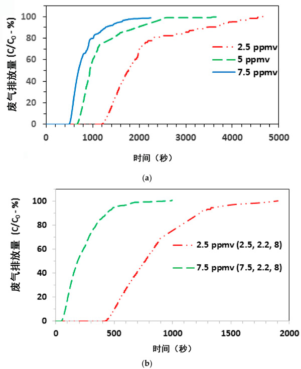 我們進行了一組實驗以評估進水氨濃度對其基于吸附的去除的影響。為此,使用6 cm和8 cm的活性炭色譜柱,在不同的進水氣態(tài)氨濃度下進行了幾次實驗。對于8 cm活性炭色譜柱,初始實驗在2.5至7.5 ppmv的氣態(tài)氨氣之間進行。分別在1.1和2.2 L/min的氣體流速下的各自發(fā)現(xiàn)顯示在圖2a,b中。顯然,隨著進水氨濃度的逐漸降低,突破點也向更長的時間轉(zhuǎn)移。例如,圖2中的結(jié)果a顯示以下突破趨勢:1295分鐘(2.5 ppmv)>712分鐘(5 ppmv)>532分鐘(7.5 ppmv)。此外,各個實驗的排氣時間值還顯示出在較低氣態(tài)氨濃度下的較長運行時間,即4000分鐘(2.5 ppmv)>2312分鐘(5 ppmv)>1574分鐘(7.5 ppmv)。此外,圖2中的吸附趨勢通常顯示出較寬的吸附穿透曲線,表明傳質(zhì)區(qū)(MTZ)的長度相對較大。這與苯在活性炭上的吸附有所不同,后者表現(xiàn)出明顯的穿透曲線。對于氨而言,這種不同的趨勢可能歸因于可以與表面酸性基團相互作用的氨部分的基本性質(zhì)。進入的氣態(tài)氨的增加及其從整體氣相到GAC表面的轉(zhuǎn)移將啟動GAC表面吸附位點(包括孔中的那些位點)更快的消耗。由于各自的表面吸附位點是固定的和有限的,因此預計在較高的進水氨濃度下,較早的突破以及較早的耗盡將逐漸發(fā)生。