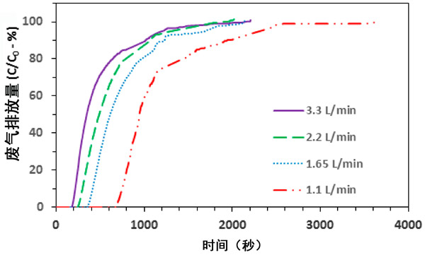 本研究還使用基于數(shù)據(jù)坑的活性炭研究了氣體流速對氨吸附的影響。圖3提供了1.1至3.3 L/min的氣體流速的相應結(jié)果。通常,氨氣流量的逐漸增加也會導致相應的穿透時間和排氣時間響應逐漸減少(圖3)。例如,流量為1.1、1.65、2.2和3.3 L/min時的突破時間分別為712、383、272和197 min(圖3)。因此,較高的突破時間值在較低的氨氣流速下蒸發(fā)。此外,對于1.1、1.65、2.2和3.3 L/min流量研究,還分別記錄了2312、1673、1315和1213分鐘的排氣時間。這類似于上述突破時間趨勢,可以解釋如下。在較低的流入氣體流速下,氨分子從氣相到活性炭表面的傳質(zhì)速率也相對較小。因此,與較高氣體流速下的活性炭表面部位相比,單位時間內(nèi)所占據(jù)的活性炭表面部位也更少,產(chǎn)生更高的穿透時間和耗竭時間響應(圖3)。這些發(fā)現(xiàn)對于實際應用尤其重要。