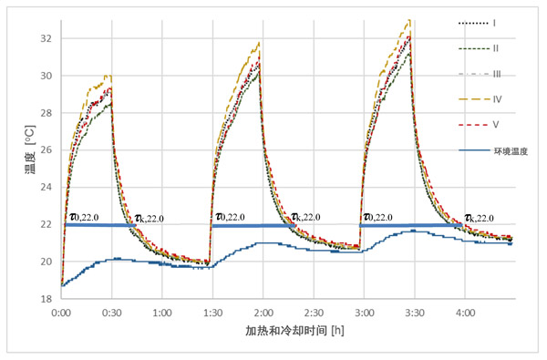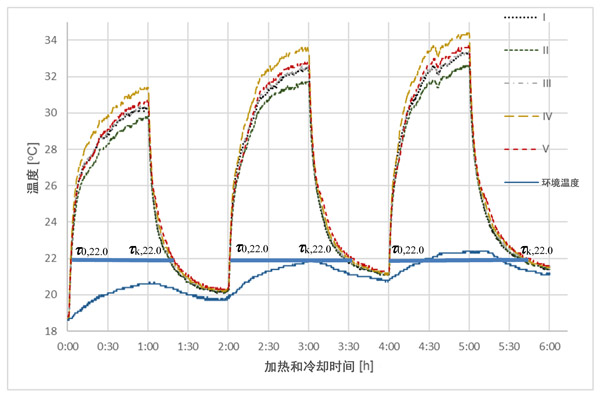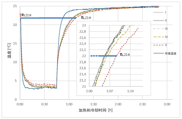 在分析曲線如圖2,圖3和圖4中,并收集結果,在一個溫度(22℃)中選擇,清楚地表明不同相變材料的影響活性炭中的量上的周期時間長度與發(fā)生個體樣品中的熱交換過程。相對于溫度傳感器的更高的質量和熱容量,即使吸附的相變材料的量很小,也可以看到處理時間的差異。當與參比樣品(I),沒有相變材料,總的冷卻和加熱時間的所有樣品與相變材料的不同水平長。對于樣品V,此時間延長了7.5%,對于樣品IV,延長了5.2%,對于III,延長了2.4%,對于樣品II(未活化的活性炭),僅延長了0.2%。
