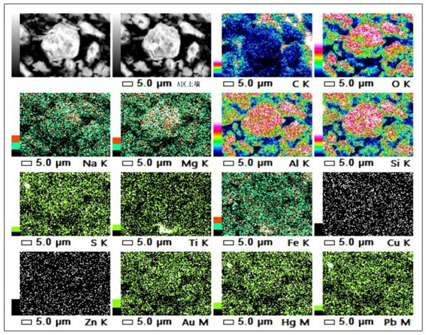 SEM-EDS測試使用了三個樣本,即A區域樣本,B區域樣本和原始土壤樣本。分析了這三個樣品。尋找的參數是充當污染物的重金屬元素。該測試的結果顯示了土壤中存在的元素的質量百分比。掃描電鏡是一種用于表面觀察的工具,其焦點深度大于光學顯微鏡,可以直接觀察復雜的表面而無需復制。SEM圖像顯示出樣品的形態狀態,顯示出大小不規則的團塊。同時,EDS分析非常適合揭示樣品中的化學元素和化合物。EDS的元素映射將為對象表面上的每個元素賦予不同的顏色,并定量分析每個元素的百分比。