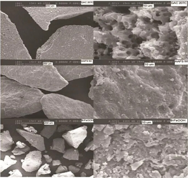 廢水中不同類型的腐殖質(zhì)會(huì)改變化學(xué)和物理特性,因此,它們與不同類型的吸附劑相反地相互作用。關(guān)于吸附劑的孔隙率,活性炭主要是微孔的,具有非常大的表面積。β-FeOOH的情況尚不清楚,因?yàn)椴煌姆椒ńo出的結(jié)果不同。但是,鐵化合物上有可能存在微孔。與活性炭相比,可用于AAFS和β-FeOOH的吸附面積小。但是,被吸附物的大小可能使其無法穿透微孔,因此限制了對活性炭的吸附,但是活性炭的孔隙率是可控的所以能解決這方面問題。