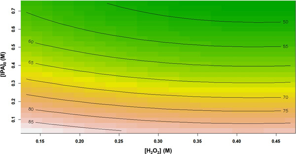 圖2顯示了總有機(jī)碳去除效率百分?jǐn)?shù)與H 2 O 2濃度和初始異丙醇濃度的關(guān)系。從響應(yīng)輪廓中可以看出,將異丙醇初始濃度從0.038 M增加到0.743 M,導(dǎo)致TOC去除率從85.17%急劇降低到46.29%。可能是因?yàn)樵谙嗤膽?yīng)用反應(yīng)條件下,自由基(OH•)的數(shù)量保持恒定,而初始異丙醇濃度卻增加了。換句話說,相對(duì)較少量的氧化基團(tuán)可用于攻擊異丙醇分子。類似地,總有機(jī)碳降解性能也隨著H 2 O 2濃度的增加而逐漸降低。過量的H 2 O 2可能促進(jìn)自動(dòng)清除反應(yīng)的發(fā)生。