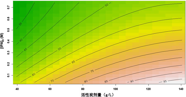 圖2:過氧化氫濃度和初始異丙醇濃度的相互作用效應(yīng)及其對(duì)總有機(jī)碳去除率的影響。活性炭的劑量保持恒定在90 g/L。