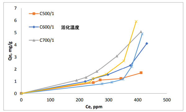圖3顯示了鈣離子的吸附等溫線。等溫線表示分類的I型或II型。較低溶液濃度下的小肩部可能暗示了鈣離子微孔填充的單層吸附飽和。這表明孔表面與鈣離子之間的相互作用較強。活性炭的低孔隙度仍表示III型等溫線,因為沒有明顯的微孔可以被鈣離子填充,而不是外表面和大孔。