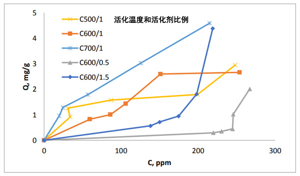 從圖2中可以看出,活性炭在不同的活化溫度(500℃,600℃和700℃)和活化劑比率(0.5、1.0和1.5)下的鋰吸附等溫線。似乎在較低濃度下吸附能力相對較低。這表明鋰離子對活性炭表面的親和力低。高濃度下容量的增加與孔隙率成正相關。活性炭的較大表面積傾向于更多地吸附鋰離子。在等溫線的分類中,該等溫線被認為是III型等溫線,對于無孔或大孔吸附劑來說是典型的。因此,鋰離子似乎不附著在微孔內部,而是附著在外部和大孔表面。活性炭對鋰離子的親和力低。炭表面的碳原子與溶液中的鋰離子之間的低相互作用可能是由于離子的原子質量低所致。原子間勢相互作用表明該力與相互作用原子的原子質量以及原子之間的距離具有正相關。
