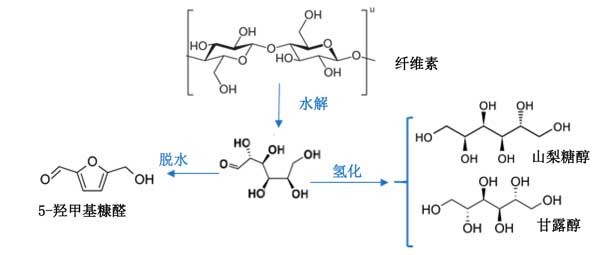 從纖維素中所示產物的反應途徑的簡化方案在圖2展示。在空白試驗(無催化劑)中,纖維素轉化率為35%,并且形成了少量的葡萄糖和羥甲基糠醛。在用活性炭負載的釕催化劑進行的測試中,與空白實驗相比,纖維素轉化率顯著提高,并且山梨糖醇收率很高。這些數據中的實驗誤差低于5%。