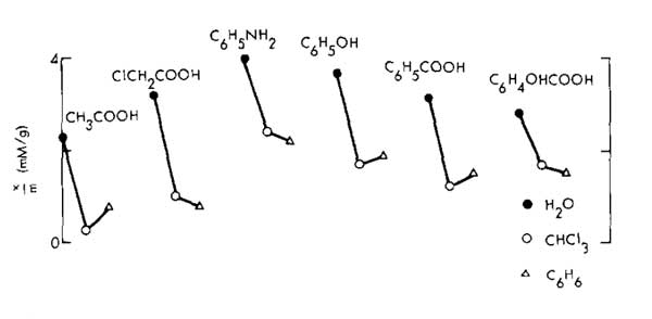 通過測(cè)量水,氯仿和苯中溶液對(duì)乙酸,一氯乙酸,苯甲酸,苯酚,苯胺和水楊酸的吸附,研究了溶劑極性的影響。活性炭的結(jié)果如圖2所示。-Cl在乙酸分子中的吸附總是增加,但是在有取代苯的情況下,吸附順序是