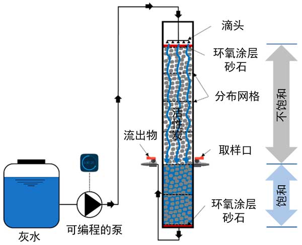 圖1:用于灰水處理的實(shí)驗(yàn)室規(guī)模的單級不飽和飽和活性炭濾池的示意圖。