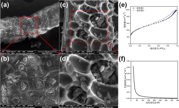 圖1:(a,b)一般活性炭和(c,d)新活性炭的掃描電子顯微鏡圖像和各自的放大倍數;(e)新活性炭的N2吸附-解吸等溫線,(f)由N2等溫線分析得出的孔徑分布。