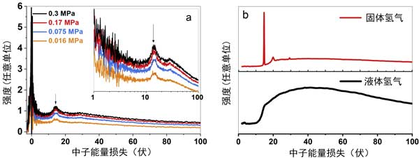 圖2:(a)鈦活性炭上的氫的INS光譜。(b)從中子數(shù)據(jù)庫中獲得的熱能中子在液體對H2(黑線)和固體對H2(紅線)上收集的INS光譜。