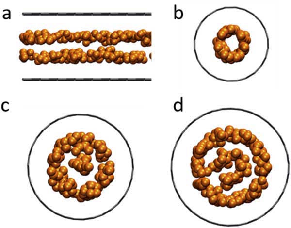 圖3:模擬結果獲得的氫良好堆積和取向,氫被限制在孔徑為0.66nm的狹縫形孔和孔徑為0.60nm,0.99nm和1.16nm的孔中,氫分子用單個金球表灰線表示活性炭原子。