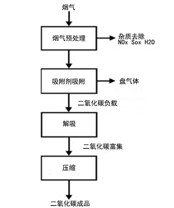 二氧化碳的吸附技術的簡化圖在圖二顯示。首先將煙氣中的水分,硫和氮氧化物凈化。然后,所制備的氣體進入使用固態吸附劑的吸附階段,例如活性炭,沸石,金屬有機骨架,多孔聚合物,基于堿金屬和胺的碳酸鹽的固體材料,碳球等。之后,吸附劑進入解吸階段,在此階段釋放出富含CO2的氣體混合物,然后在壓力下將其壓縮。該技術的優點是二氧化碳萃取效率高,再生成本低以及吸附劑操作的穩定性。活性炭對CO2和N2的吸附能力很高,具有不同于沸石的大比表面積,并且還可以在潮濕條件下工作。而且,活性炭比沸石具有更低的吸附熱,因此它們可以更容易地再生。因此,在25°C和1bar的溫度下,活性炭的吸附熱為3kJ,而沸石為30kJ。收集二氧化碳的吸附劑質量的重要指標之一是二氧化碳的吸附量。基本上,在靜態條件下和動態條件下都進行吸附容量的研究。