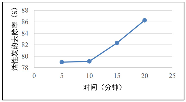 吸附時間測試:將豆腐廢液行業樣品溶液制備到四個燒杯中。在每杯中加入多達0.5克的椰殼活性炭。攪拌下靜置5分鐘,10分鐘,15分鐘,20分鐘。之后,用移液管吸取10mL溶液,然后將其放入試管中。加入0.4mL苯酚溶液,0.4mL硝普鈉,1mL氧化溶液。放置1小時以產生顏色。形成顏色后,使用濾紙將活性炭與樣品溶液分離。倒入比色杯,使用分光光度計對其進行分析,讀取并記錄其在640nm波長處的吸收。時間變化的吸附用K2CO3活性炭和HCl活性炭進行兩次。